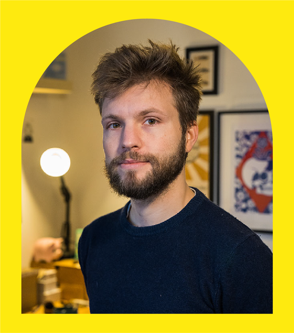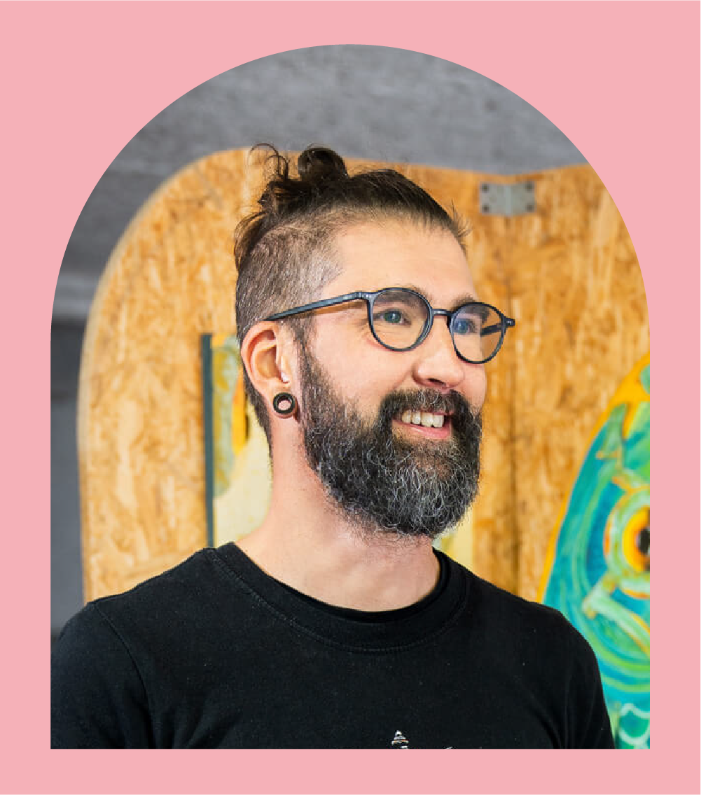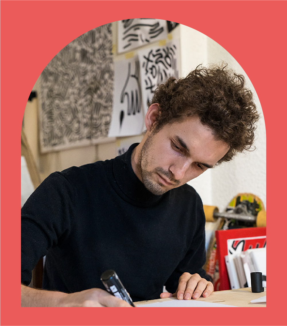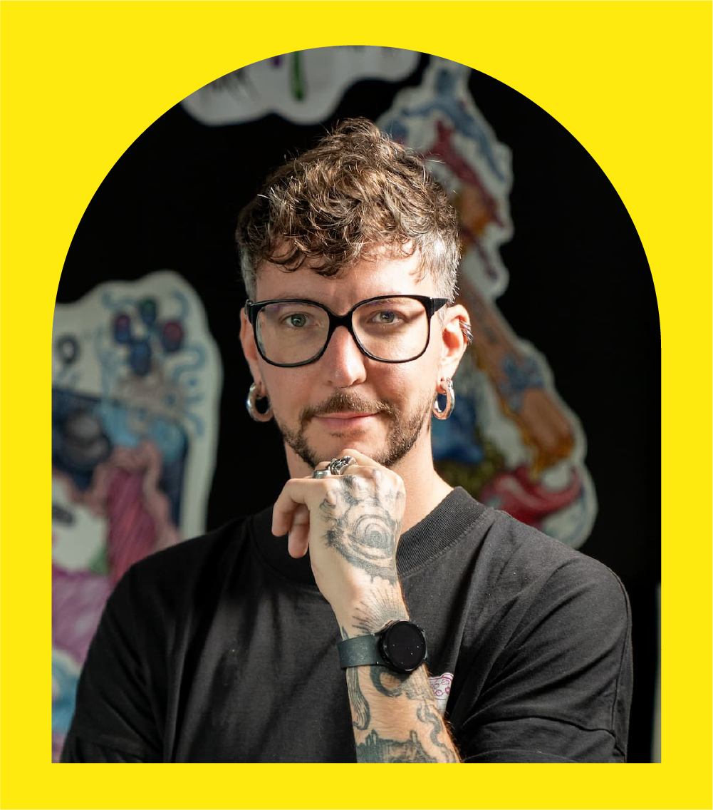 Gol3m, artiste muraliste, mêle aujourd’hui dans son travail illustration et peinture murale. Inspiré très jeune par Joann Sfar, la fresque acrylique devient son terrain de jeu favori, peuplé de formes géométriques et de couleurs vives. Il y explore des univers empreints de sorcellerie, de croyances anciennes et de costumes festifs, créant un monde graphique aussi étrange que captivant.
